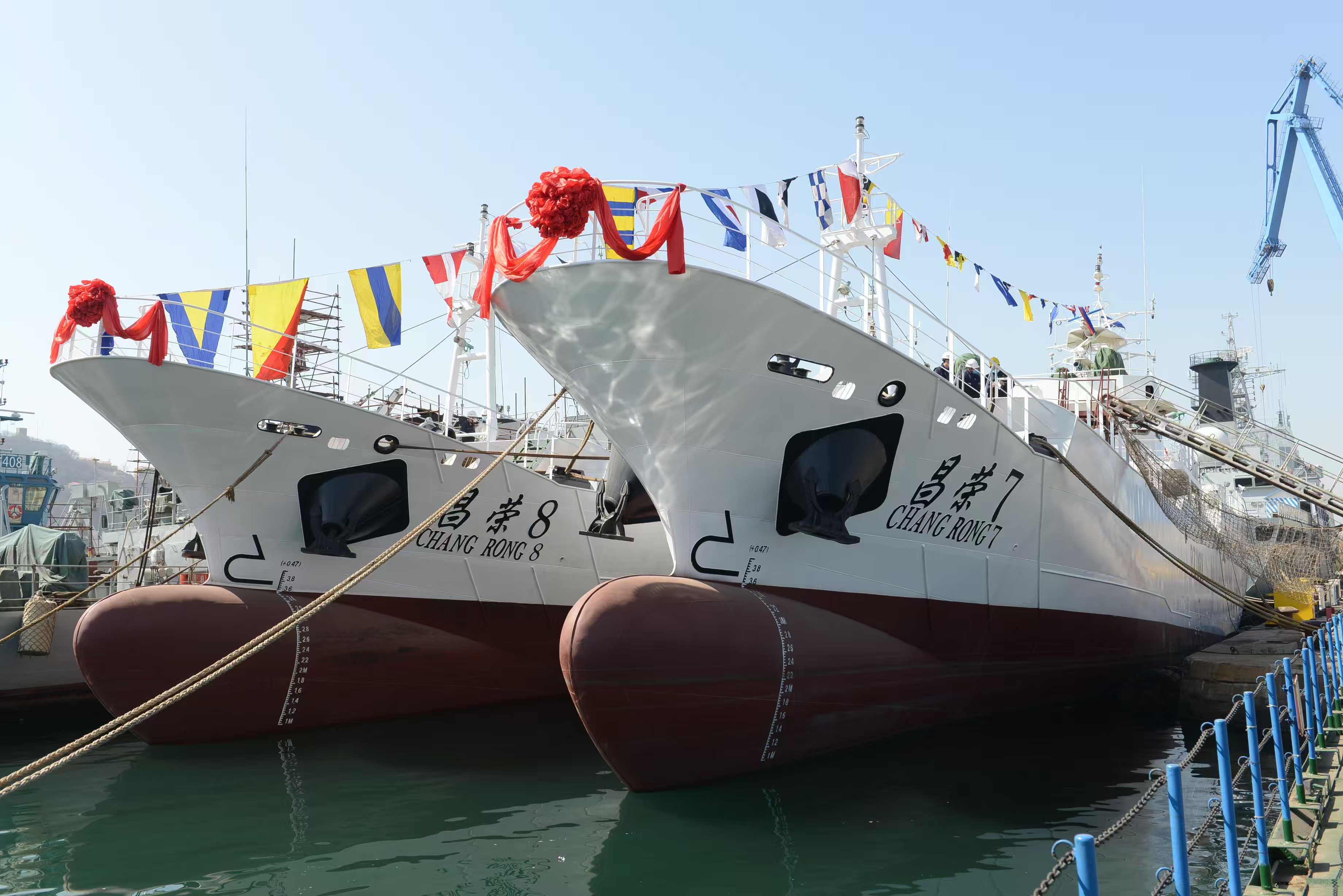 昌荣7号,昌荣8号是大连恒星自主设计开发的高纬度金枪鱼延绳钓渔船,是我国唯一具备在大西洋北部作业的船型。为适应该海域作业,大连恒星委托荷兰marin公司根据该海域的季风,水流特点,进行了水池试验;在试验的基础上进行了二次深入设计,使该船型进一步优化,更加适应该海域风急浪高的恶劣环境。